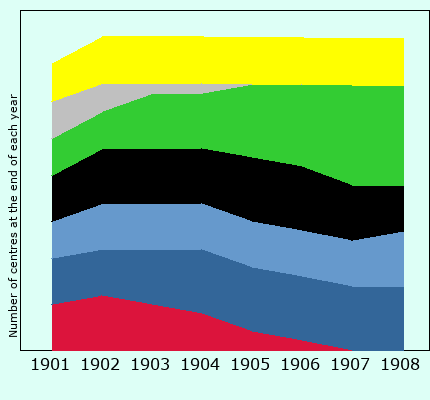 | Austria | 5 | 6 | 5 | 4 | 2 | 1 | 0 | 0 | | England | 5 | 5 | 6 | 7 | 7 | 7 | 7 | 7 | | France | 4 | 5 | 5 | 5 | 5 | 5 | 5 | 6 | | Germany | 5 | 6 | 6 | 6 | 7 | 7 | 6 | 5 | | Italy | 4 | 4 | 6 | 6 | 8 | 9 | 11 | 11 | | Russia | 4 | 3 | 1 | 1 | 0 | 0 | 0 | 0 | | Turkey | 4 | 5 | 5 | 5 | 5 | 5 | 5 | 5 |